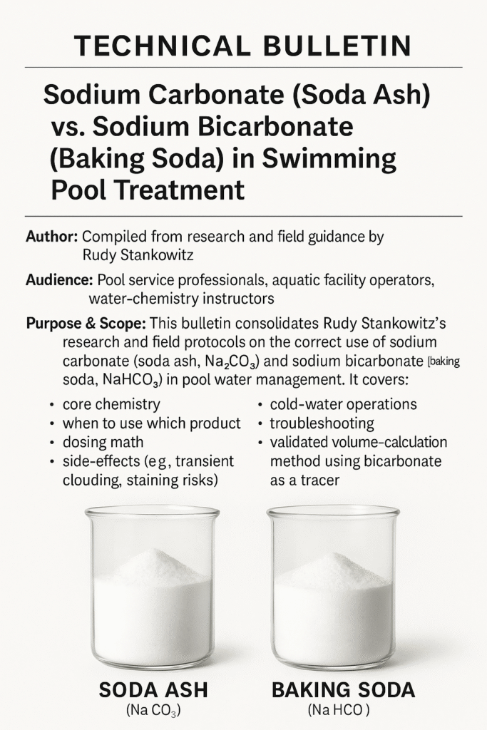 This bulletin consolidates Rudy Stankowitz’s research and field protocols on the correct use of sodium carbonate (soda ash, Na₂CO₃) and sodium bicarbonate (baking soda, NaHCO₃) in pool water management. It covers: core chemistry, when to use which product, dosing math, side-effects (e.g., transient clouding, staining risks), sequencing with other chemicals, buffer strategy, cold-water operations, troubleshooting, and a validated volume-calculation method using bicarbonate as a tracer.